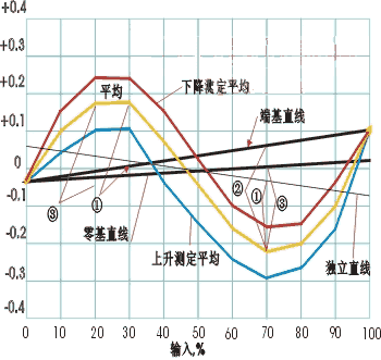 校准曲线与适当的直线(独立直线、零基直线、端基直线)之间的最大偏差为线性度误差。在整个输入信号范围内,对上升和下降的两个方向进行两次以上的测定,在各个输入信号的测定点,求出各数据的平均值,用这些点画出来的平均曲线和直线之间的最大差值就是线性度误差。