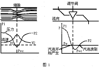 如图1所示,阀座相当于节流孔板。高压流体经调节阀节流孔时,静压能与动压能相互转换,流速的增加导致压力降低,当压力降到等于或低于该液体在入口温度下的汽化压力时,溶解在液体中的气体迅速膨胀而形成汽泡。带着气泡的液体流过阀门节流孔后,在宽敞的下游流道中流速下降压力回升。当压力回升到P2时,汽泡溃裂,这即是空化过程。汽泡溃裂时释放出巨大的能量,对阀座、阀芯等节流元件产生破坏,即空蚀。空化的破坏力很大,一般的阀在空化条件下经两三个月,甚至一两个星期运行,即遭受严重空蚀,致使阀座泄漏量高达额定流量的30%以上,调节阀完全丧失调节控制功能。