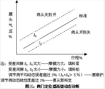 智能阀门定位器具有丰富的软件功能,如自动调整零点和满量程;组态需要的阀门特性,配上专用软件如FISHE的智能定位器的VAVLELINK软件;NELE的智能定位器的VAVLEMANAGE TM,软件九具备了高级动态诊断功能,将阀门的机械性能指标和控制系统的指标结合起来,判断阀门损坏情况具体如图三。